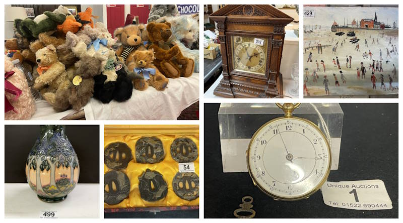 Including a collection of Gold, Silver Coins, Jewellery, Figurines, a large collection of Teddy Bears including Charlie Bears (A Bear-Lover’s Dream Over 200 Teddy Bears Go Under the Hammer at Unique Auctions), Moorcroft, Old Tupton Ware, Anita Harris, Netsuke, Japanese items, Furniture, Watches, Mirrors, Rugs, and more