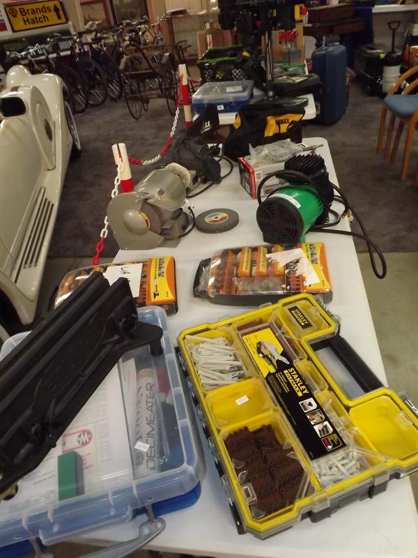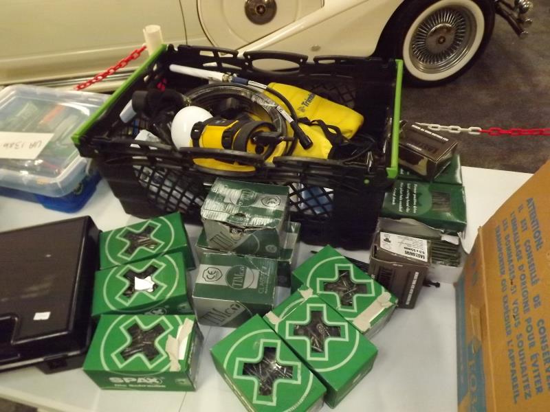 Mainly new tools including a Bench Pillar Drill. Assorted new and boxed Screws. New Rotary Accessory Tool Set. Socket Sets, Bench Grinder and much more