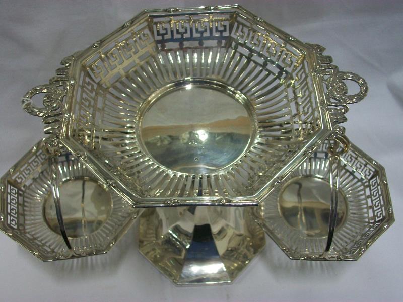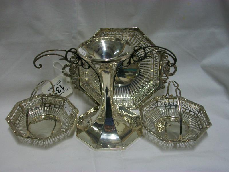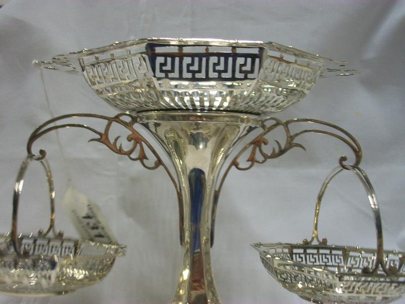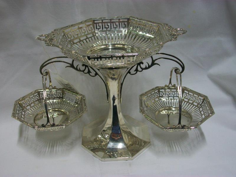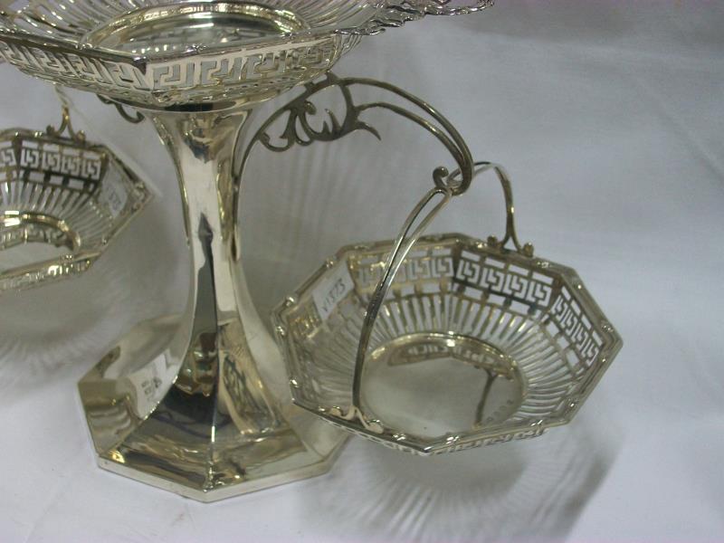 A HM silver table centrepiece being stand with 3 baskets, Birmingham 1911