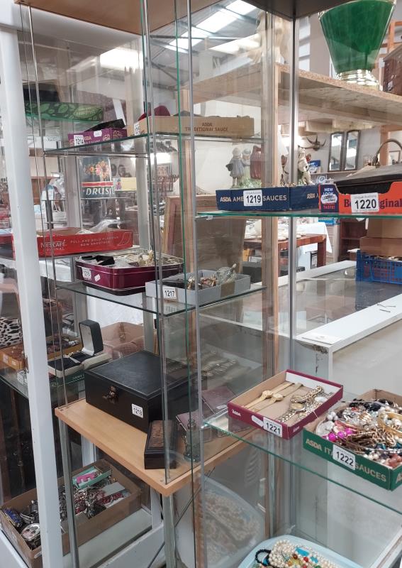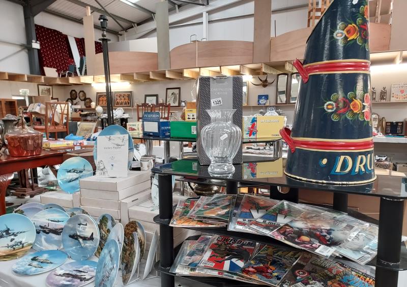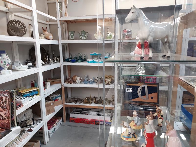Lots include: A large selection of Costume jewellery; Silver plate; Ceramics and China (Beswick, Coalport, Moorcroft, Brischamware, Royal Doulton, Royal Worcester, Wedgewood, plus a large selection off Indian Tree China etc); Clocks and watches, plus clock movements and clock parts for spares and repairs; Coins and medals; Books, periodicals, a quantity of old Illustrated London News, plus Comics, (Including Eagle, Victor, Marvel Hulk, Tiger, Cor!!, Buster, Star Wars Weekly etc); Cameras and associated equipment including boxed Fugi film X-S1, Panasonic Lumix, JVC video camera, tripods & holdalls etc); Artwork (Oils, watercolours and prints); Musical instruments including a drum kit, a marching drum, Tom-Tom drums, a double base on stand, guitars, record collections plus more; Stamp collections; Sewing and Knitting machines; fabrics and haberdashery including buttons and yarns; Vintage toys including Corgi Classics, a large Georgian style dolls house; Ephemera – collections of vintage postcards, plus much more.