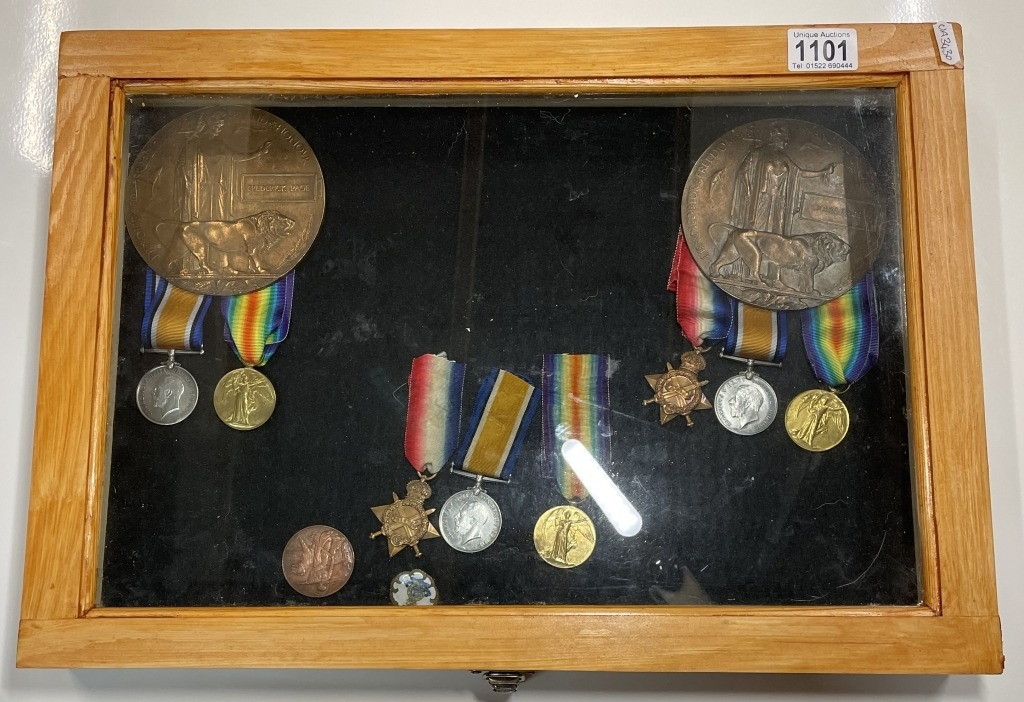 Lot 1101 is a cased and exceptionally rare collection of First World War medals and two death plaques, awarded to three brothers of the same family: